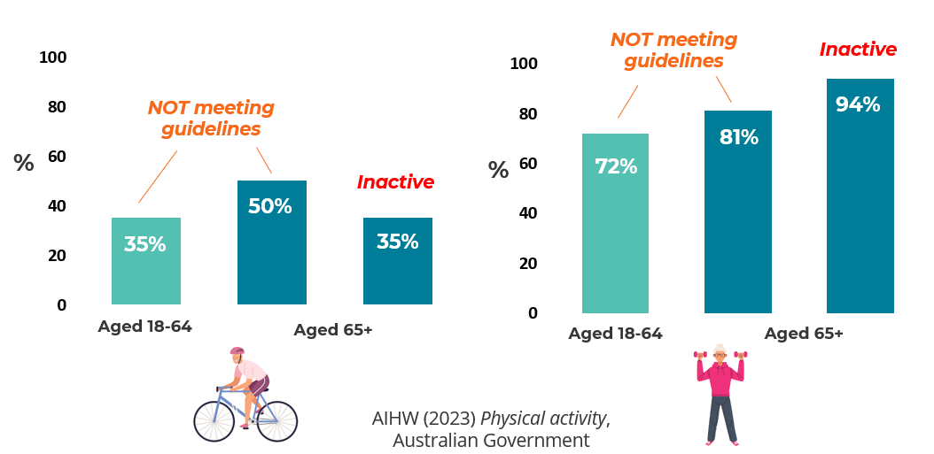 Historically, these guidelines focused only on aerobic training. Only in the last 15 years or so has resistance training been included. But despite the comparable benefits, there’s still a very wide gap between the proportion of those who meet aerobic compared to resistance training guidelines. As the figure below shows: