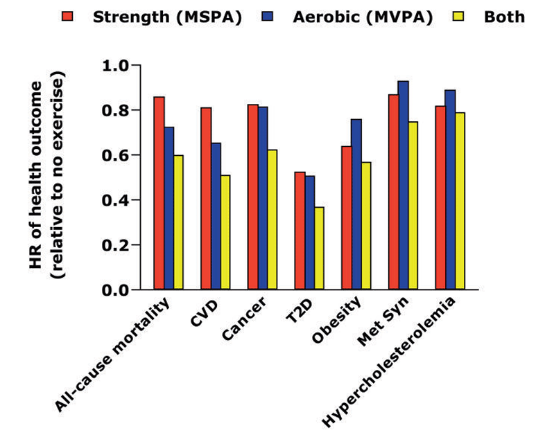 Read time: 4 minutes What’s better: cardio or weights? It’s an age-old question. Well, maybe not really… Most of us associate cardio (or aerobic training) with getting “fitter” and resistance training with getting “bigger” (muscles). But let’s face it, not everyone cares about these things. So how do they stack up when it comes to general health benefits? The answer might surprise you. Aerobic versus resistance training for healthMany link the health benefits of exercise with aerobic training. We’re talking about things like reduced blood pressure or blood sugar, or a lower risk of chronic diseases such as heart disease or diabetes. But do we have to walk, run, ride, or swim to get these benefits? Or can pumping some iron help too? Contrary to what most people might think - science says it can. This is nicely summed up in this figure: It shows the reduction in the risk (known as a hazard ratio) of all-cause mortality and various chronic diseases with: