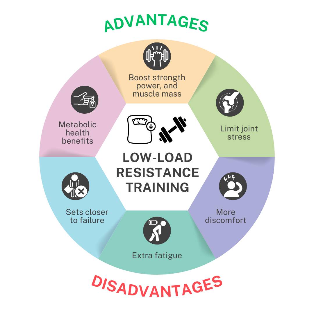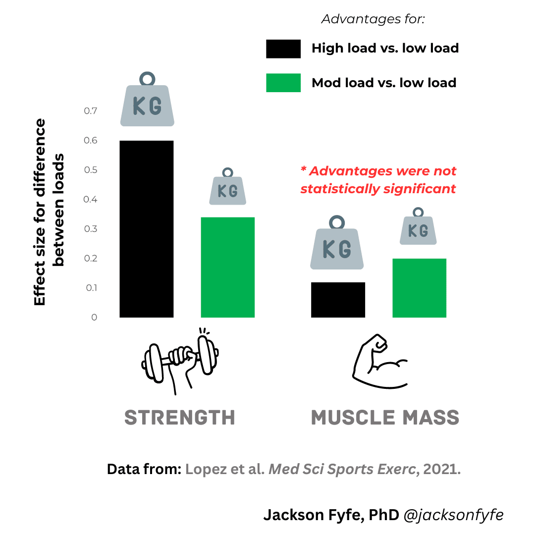 So - why might ”load” be important in resistance training? Who cares about “load”, anyway?Aside from those wanting to boast about lifting the heaviest, of course… It’s no surprise the weight lifted impacts how many reps you can do - the higher the load, the less reps are possible. But there’s more to it than that. Lifting heavier means muscles need to produce more force. We do this by sending stronger signals from the brain to the motor nerves latching onto muscle fibres. The more force that’s needed, the greater the “drive” from the nervous system, and the more muscle fibres (including both smaller Type I and larger Type II fibres) get “recruited” to contribute. This means with lighter loads, less muscle fibres are initially needed to produce the force required (unless there is maximal intent to move a light weight as fast as possible). But as more reps are performed and muscle fibres become fatigued during a set, extra fibres are called into play. So it’s possible to recruit a large proportion of your muscle fibres with heavy OR light weights. The difference is, longer sets (more reps) may be needed to achieve this with lighter loads, and the signals from the nervous system may be lower than with higher-load training. The question is: how does this all impact changes in strength or muscle mass? Does load matter for strength or power?It’s commonly believed heavy weights are needed to maximise strength. And to extent, this is true. Heavier loads can lead to better strength gains, particularly when strength is measured in dynamic movements (like squats or bench press) included in a training program. But here’s the thing: When strength is tested using an unfamiliar movement (that wasn’t “practiced” during a training program), higher or lower loads promote similar strength gains. This means some of the advantages of higher-load training may be due to its similarity to dynamic strength tests. So lighter loads can improve strength - and the story is similar for muscle power, too. Training with higher and lower loads promotes comparable muscle power gains (at least in older adults) - so long as there is intent to move the weight quickly. Do bigger weights equal bigger muscles?The simple answer is no. In fact there’s now ample evidence load matters little for building muscle. This means lighter weights can be very effective for boosting your muscle mass. But there is one caveat: For lighter-load training, sets probably need to be taken closer to “failure” (where no more reps are possible) to build muscle. This has its challenges - like higher levels of effort and discomfort - but shows heavy weights aren’t needed for muscle gains. Here’s a summary of the advantages of high- and moderate-load training (versus lower-load training) for dynamic (1-RM) strength and muscle mass: As you can see, higher-load training can further boost strength, but the same can’t be said for muscle growth. The case for lower-load resistance trainingGiven many are hesitant with big weights, it’s good to know lighter ones are enough to improve strength or power - and especially for building muscle. But the benefits don’t stop there. Lighter weights can also offset losses in muscle and strength during periods of reduced activity. The metabolic health benefits of resistance training - like better glycaemic (blood glucose) control, and lower blood pressure and blood lipids - are similar with lighter and heavier weights, too. Lighter-load training may also limit joint stresses that can be a issue for some, like those with osteoarthritis. All-in-all, there’s a good case for including lower-load training as part of any well-rounded program. Lighter loads aren’t without their challengesThe lighter side of resistance training has many benefits. But there’s a few caveats to consider, too. Lifting lighter weights usually means longer sets (with more repetitions). And lighter sets probably need to go closer to failure for similar muscle gains to higher-load training. This means higher levels of effort and discomfort - things that could impede regular training for some. But - it’s still possible to get decent benefits if lighter sets are stopped before failure. Longer sets with lighter loads also comes with more fatigue, which means longer recovery times between sessions. So a choice to lift lighter weights must consider these possible challenges too. Maximising the benefits of lighter-load trainingIt’s clear decent gains in strength and muscle mass are possible with lighter load resistance training done: